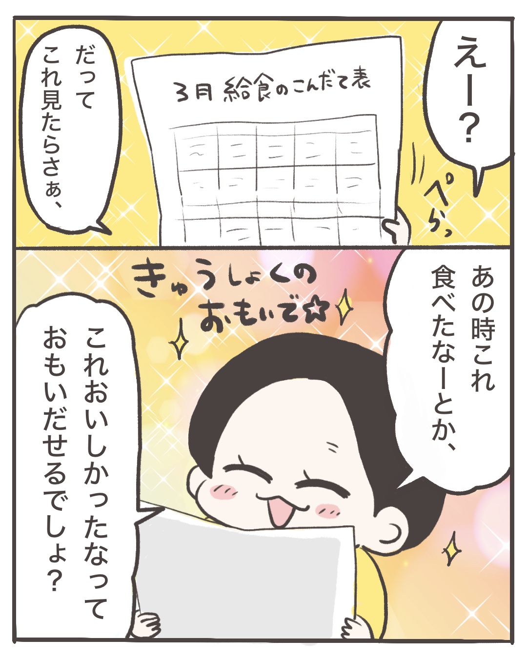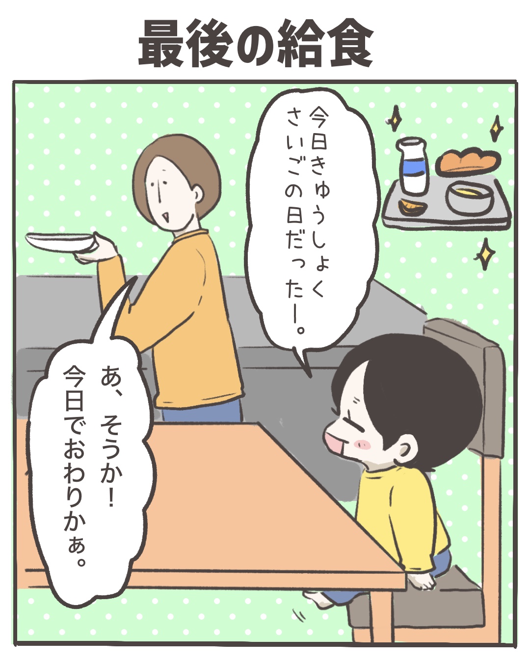 最後の給食2026.03.24日常漫画 育児絵日記日常, 育児漫画 広告 んすきぃ…! 52 コメントはこちら 同じカテゴリの記事 おなおしやさん お手紙 記憶力 わかめ 謎の暗号 気になる新一年生さん ほくろの場所 ハチマキ 前歯抜けたよ 2年生 耳チェック 2年生の醍醐味 最後の一年生 ヨーグルトアイス 最後の給食 ズレるメガネ 初めての洗濯機(後編) 初めての洗濯機(前編) なーちゃんの教え 久しぶりのカラオケ ぼく マスク かぎ針編みデビュー 母と梅の実7 母と梅の実6 母と梅の実5 母と梅の実4 母と梅の実3 母と梅の実2 母と梅の実1 前の記事 ズレるメガネ 2026.03.23次の記事 ヨーグルトアイス 2026.03.25アプリなら通知ですぐ読める! NAPBIZブログ This site is protected by reCAPTCHA and the Google Privacy Policy and Terms of Service apply.